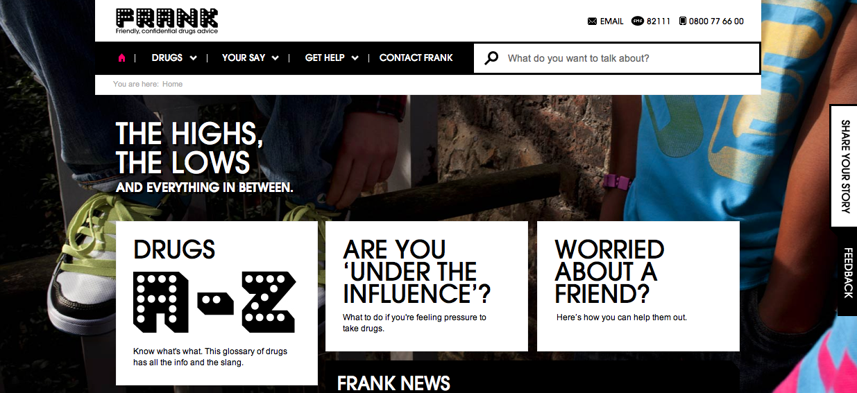 FRANK on Britannian Sisäministeriön (Home Office) ja Terveysviraston (Department of Health) yhteishanke, jonka tarkoituksena on tarjota tietoa huumausaineista brittiläisille nuorille. Kyse ei kuitenkaan ole perinteisestä huumevalistuksesta, vaan aihetta on lähestytty nuorisoa kutkuttavalla tavalla. Sivun näyttävä visuaalisuus ja kepeä ote on saanut osakseen myös Täyttääkö tälläinen sivu todellisen huumeiden vastaisen työn tarpeet? Onko FRANK todellisuudessa kirous vai pelastus Britannian huumevastaiselle työlle, sitä en osaa näin ulkopuolisena ja todellista kulttuuria tuntemomana sanoa. Kampanjaprojektina ja markkinoinnillisena toteutuksena se on joka tapauksessa hyvin mielenkiintoinen seuraavien seikkojen vuoksi: